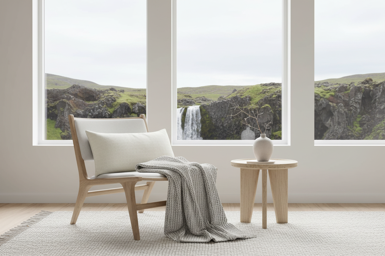 The contained fair design evokes the clean lines and natural beauty of Icelandic design, bringing a sense of calm and connection to nature into your home. The natural colorway pairs beautifully with light woods, cozy wool textiles, and the minimalist aesthetic of Nordic interiors, creating a harmonious space that feels both modern and timeless. Layer it with solid neutrals in soft greys or warm whites for a serene look, or mix with other subtle patterns for a curated Scandinavian feel.